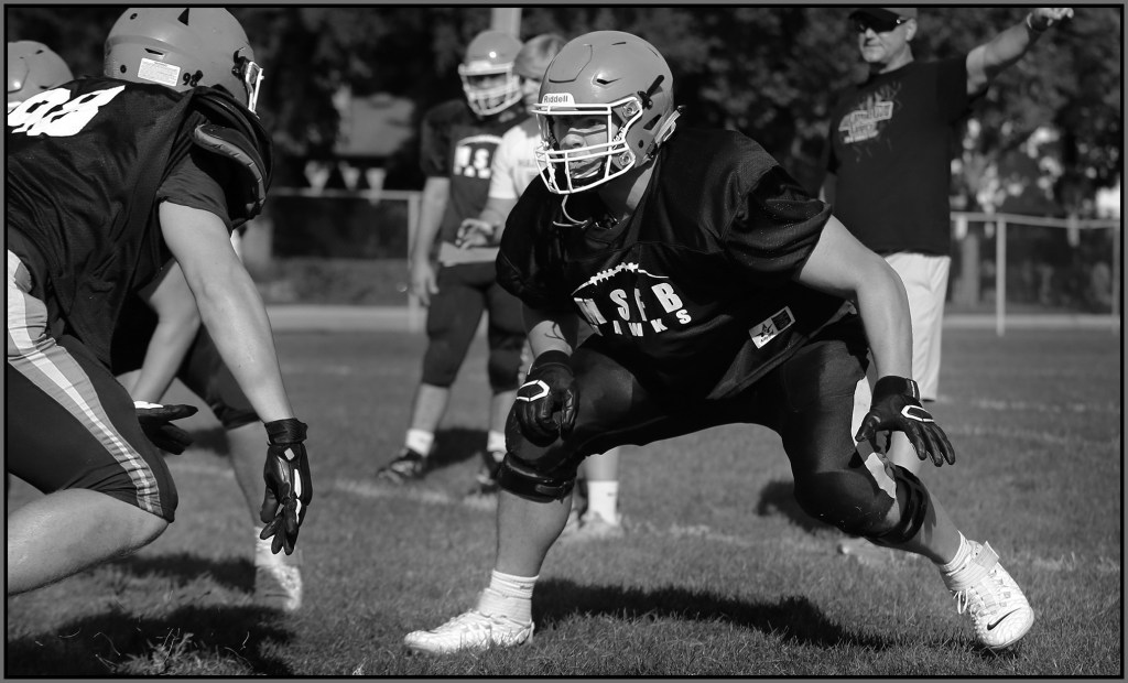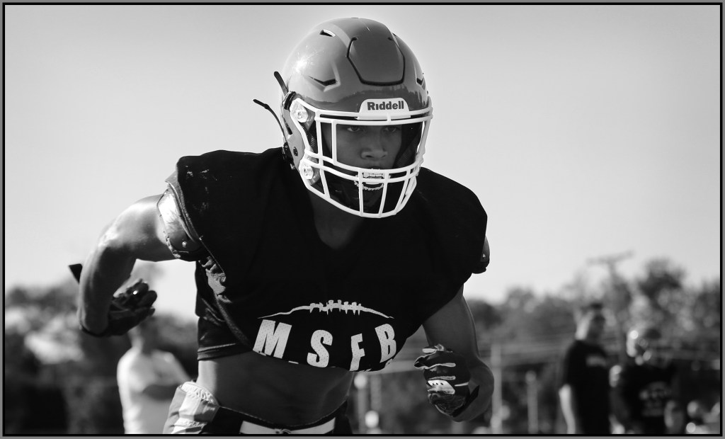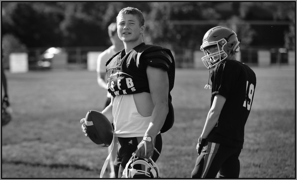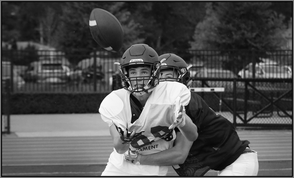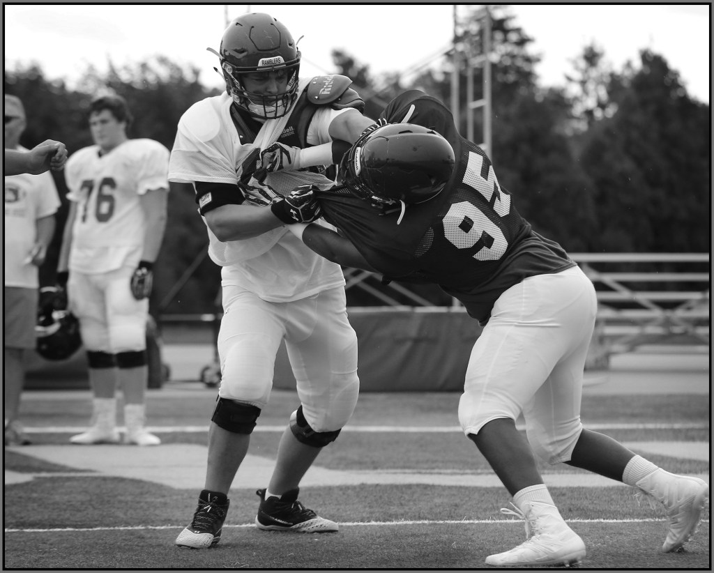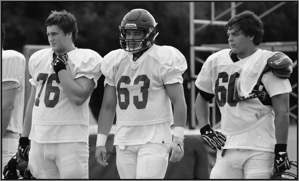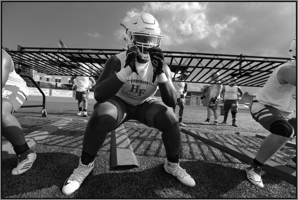 Under the lights of Friday night, my task is to show how plays and players decide the outcome of the contest. On a practice field under a withering sun on an unremarkable Wednesday afternoon, my challenge is to make photographs that introduce new players or reveal more of a returning player’s personality. Hopefully I have met my preseason challenge and the images that appear here increase football fans’ excitement for the upcoming games.