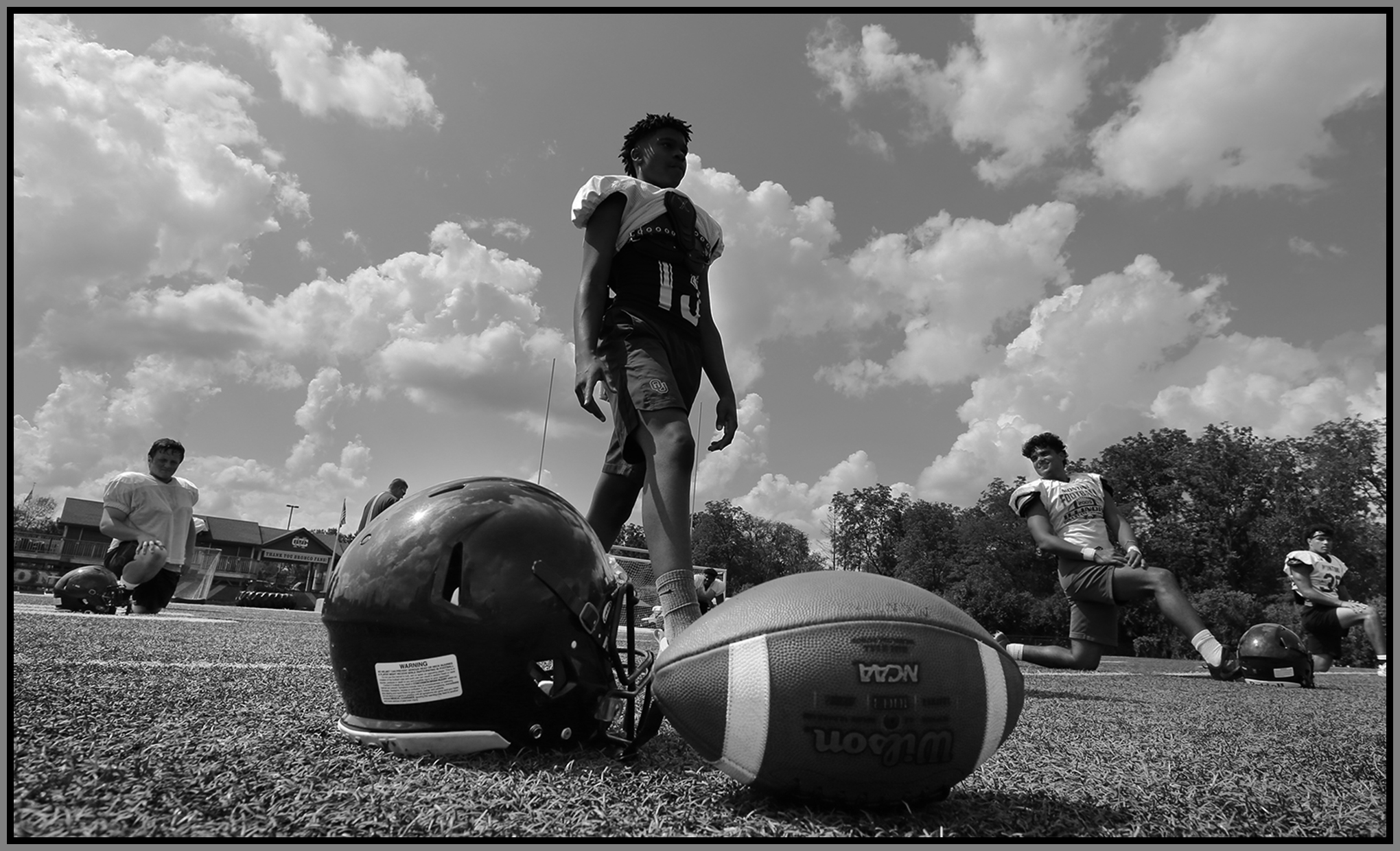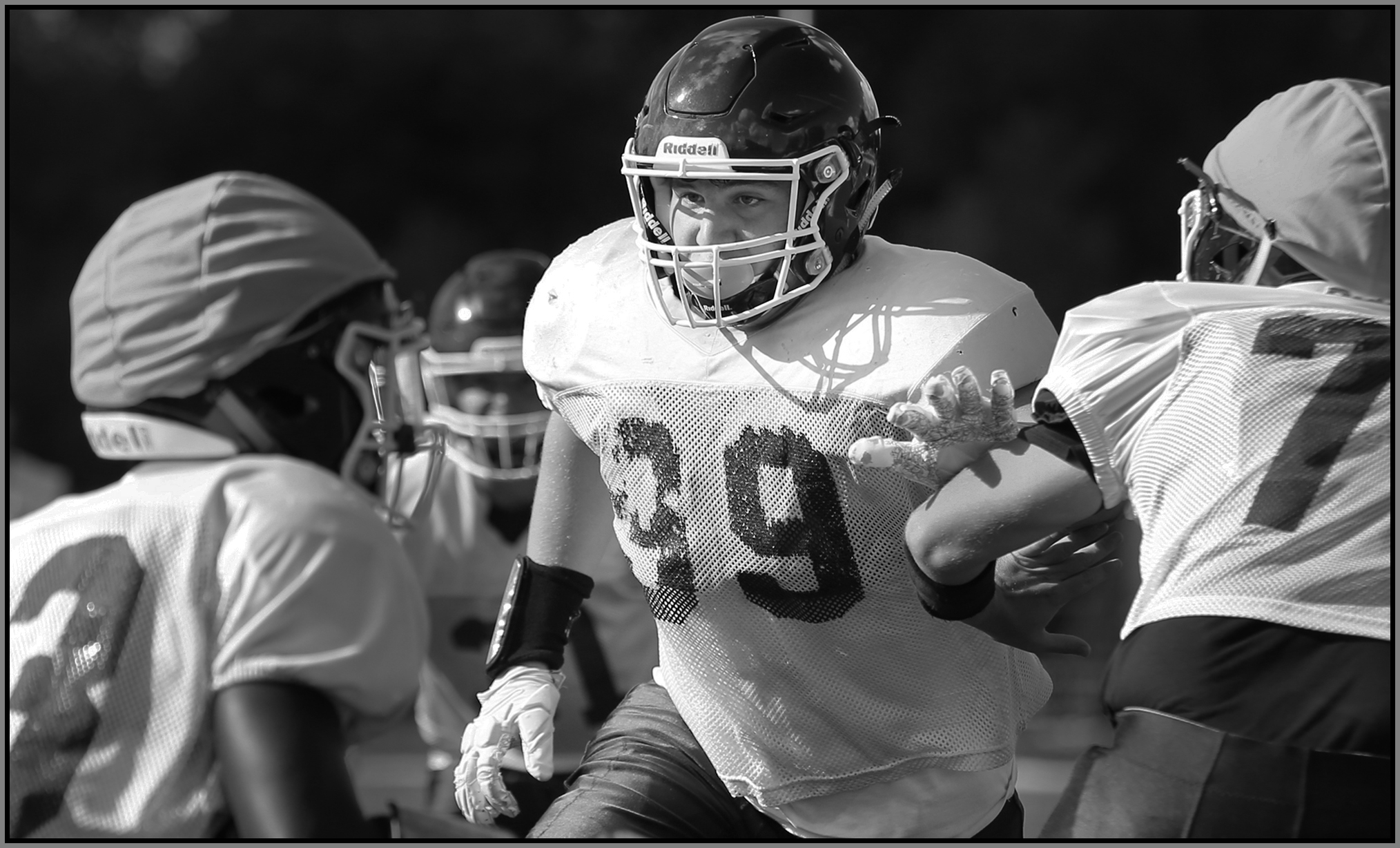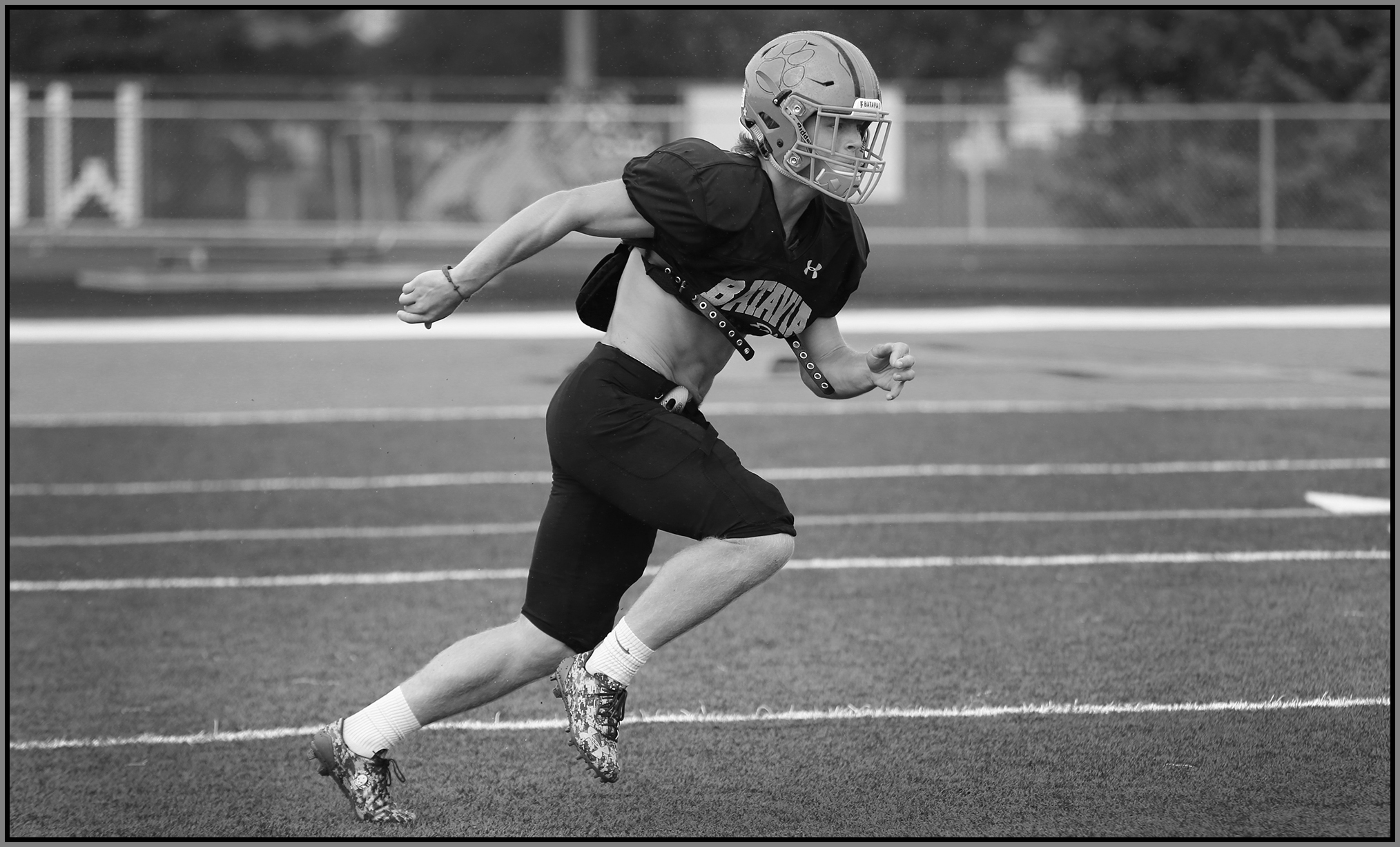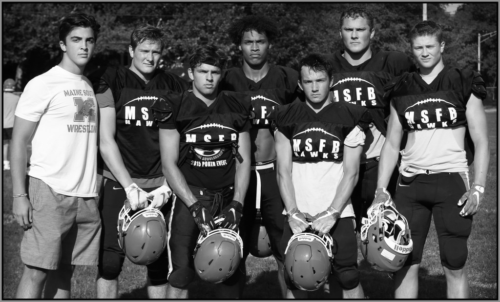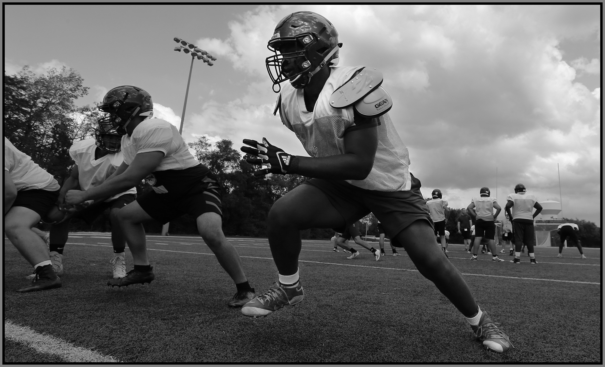 Under the lights of Friday night, my task is to show how plays and players decide the outcome of the contest. On a practice field under a withering sun on an unremarkable Wednesday afternoon, my challenge is to make photographs that introduce new players or reveal more of a returning player’s personality. Hopefully I have met my preseason challenge and the images that appear here increase football fans’ excitement for the upcoming games.