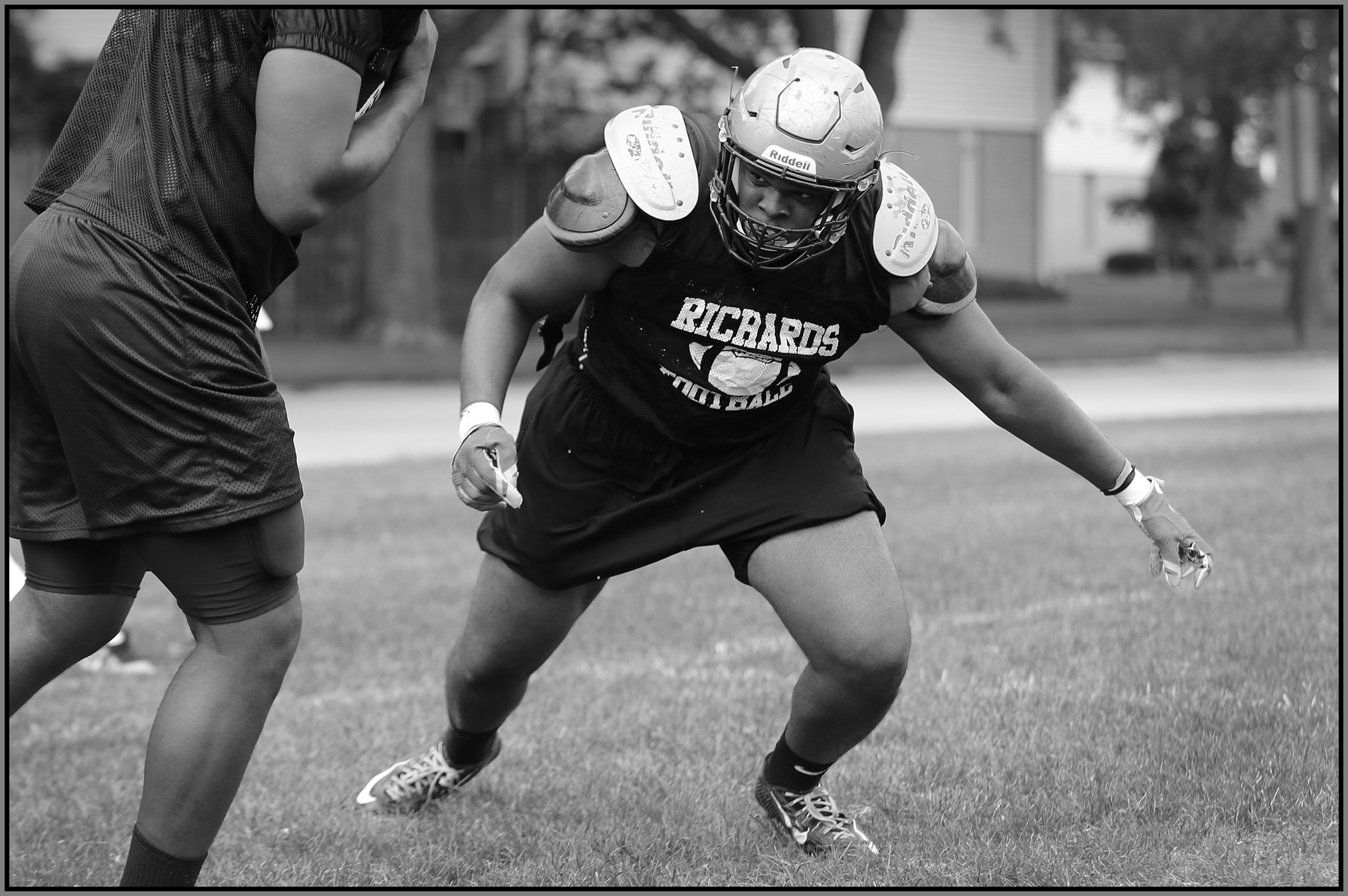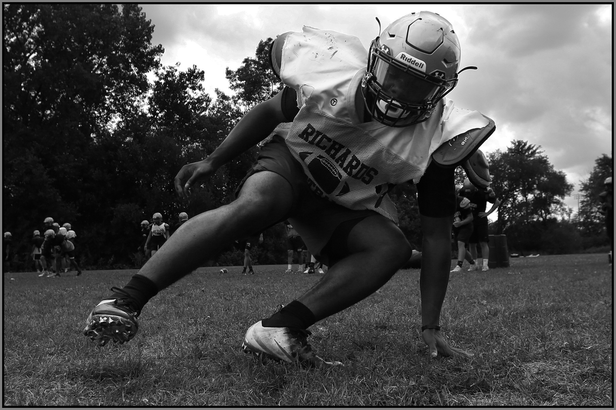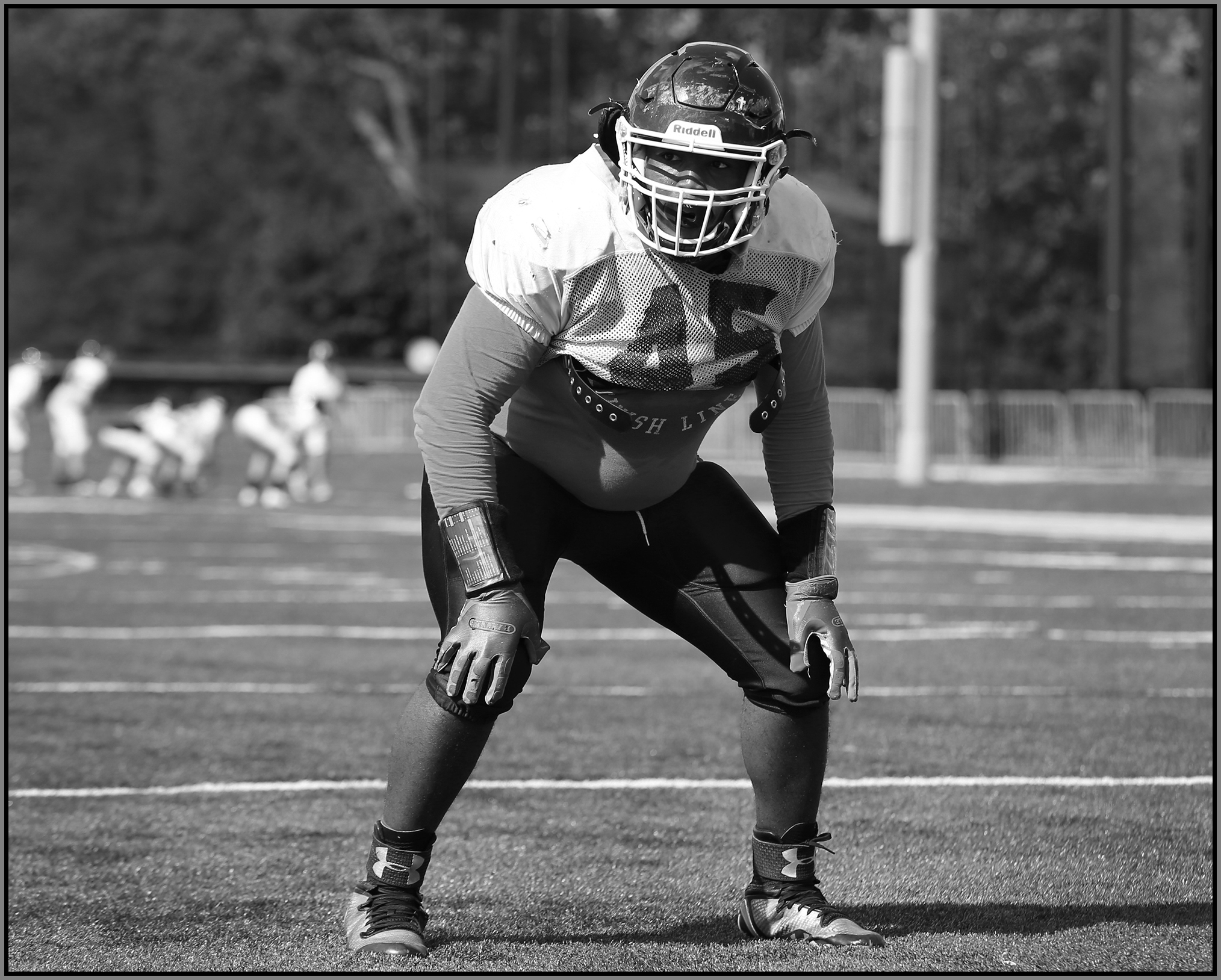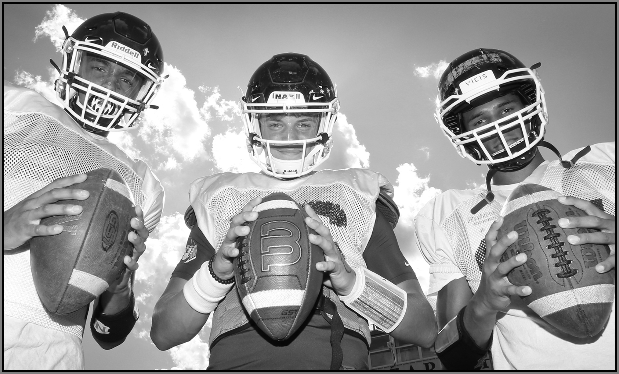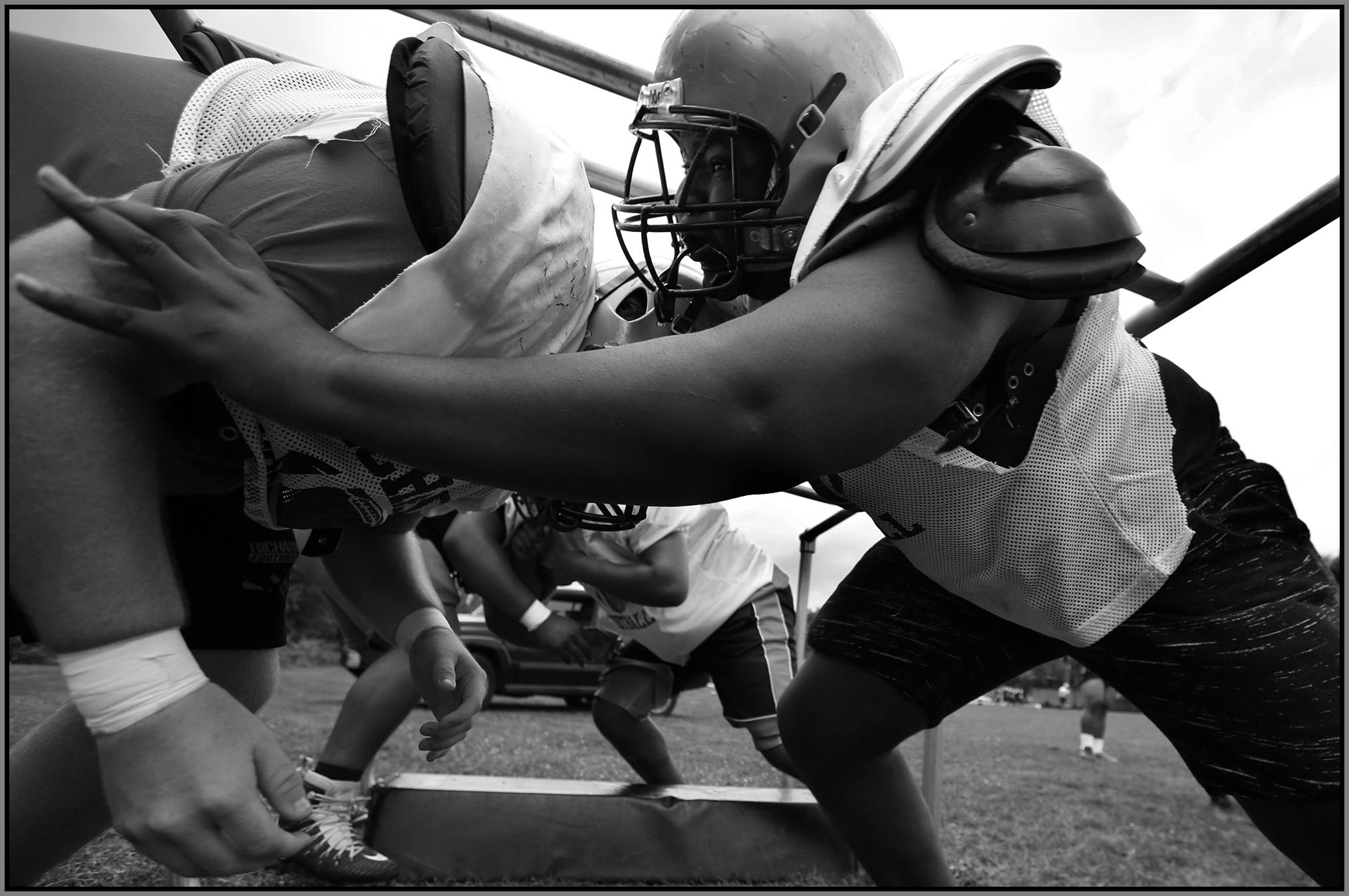 Under the lights of Friday night, my task is to show how plays and players decide the outcome of the contest. On a practice field under a withering sun on an unremarkable Wednesday afternoon, my challenge is to make photographs that introduce new players or reveal more of a returning player’s personality. Hopefully I have met my preseason challenge and the images that appear here increase football fans’ excitement for the upcoming games.