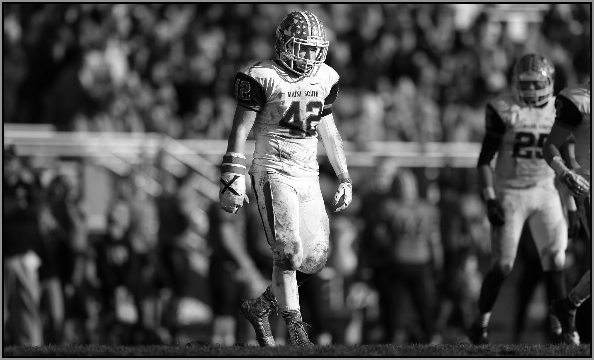 The photos to open the blog, Michael Pusateri of Maine South, those are there to remember what November football looks like. A linebacker playing hurt. A linebacker wearing the field. A linebacker giving everything he’s got. Three months from now the pain of August will be completely forgotten, and the only thought on everyone’s mind will be a state championship. November football will reveal who has had the will of a champion since day one of preseason.